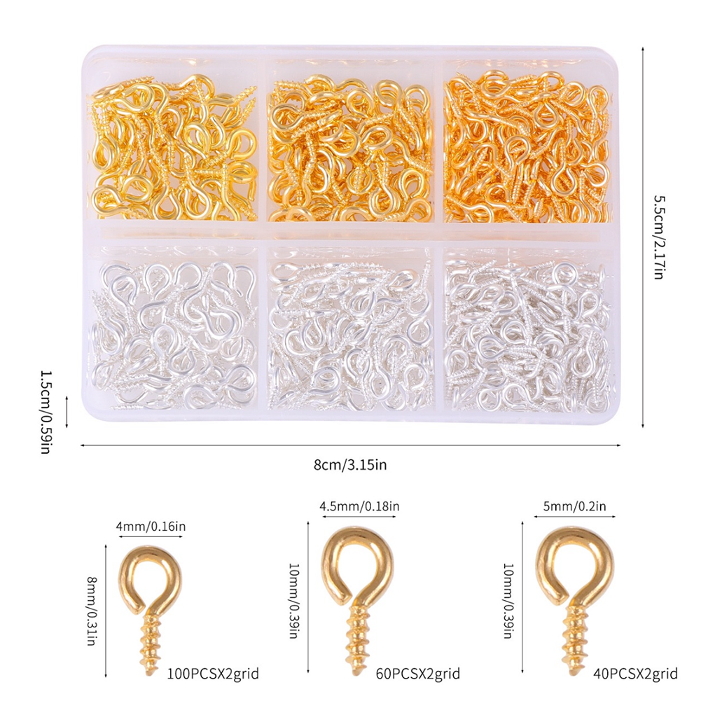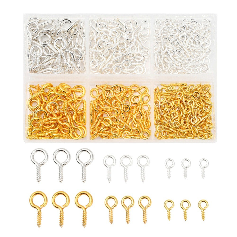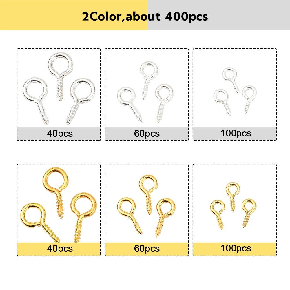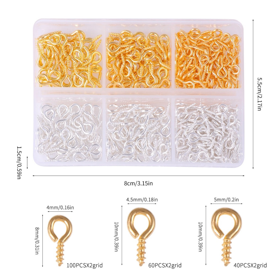 400pcs Mixed Boxed Eyescrew Tiny Jewelry Hooks Mini Hoop Clasps Threaded Metal Peg For Accessories Making Materials Handmade DIY Gold Silver
